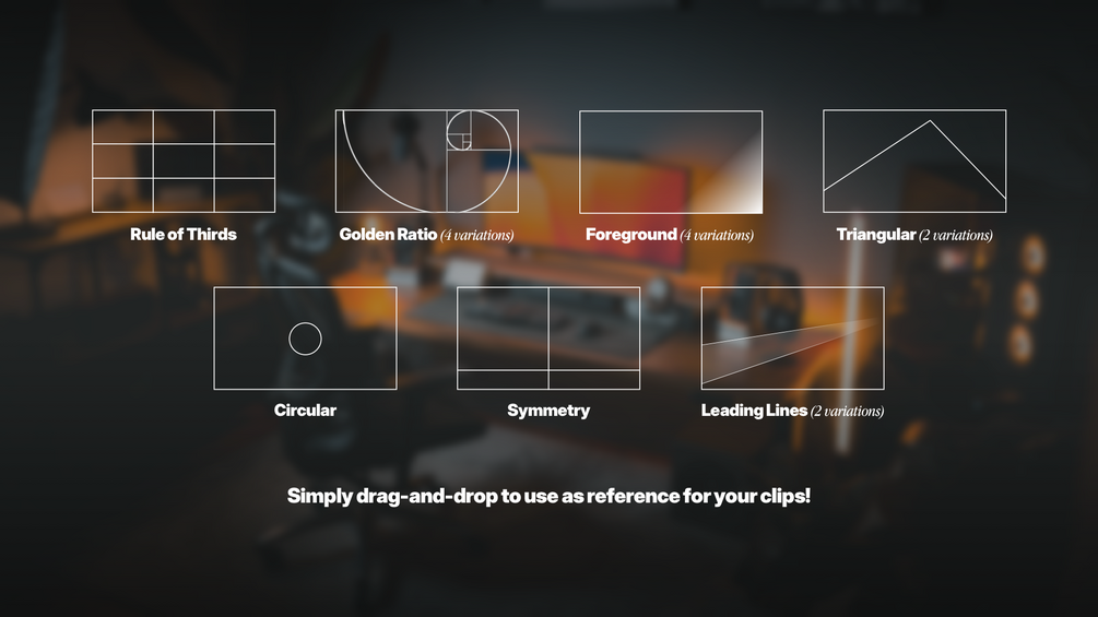 Enjoy these 15 free composition guides that you can simply drag and drop over your timeline to use as reference and create cinematic compositions immediately!